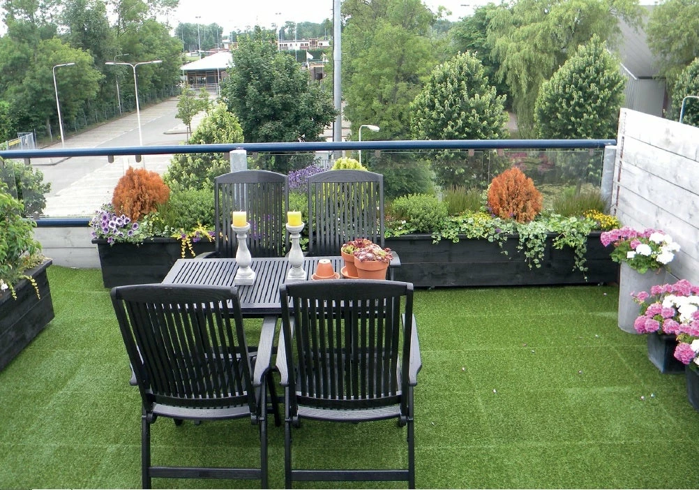 One of the main concerns when installing artificial grass on flat roofs or balconies is how it should be bonded to the waterproofing and whether it will damage the membrane. With the Grassflex tiles, you can rest assured that the recycled rubber granulate base is soft and safe for use on waterproofing membranes. Additionally, the drainage channels on the underside of the tiles allow rainwater to flow through and off the waterproofing, making them ideal for use in inclement weather conditions.